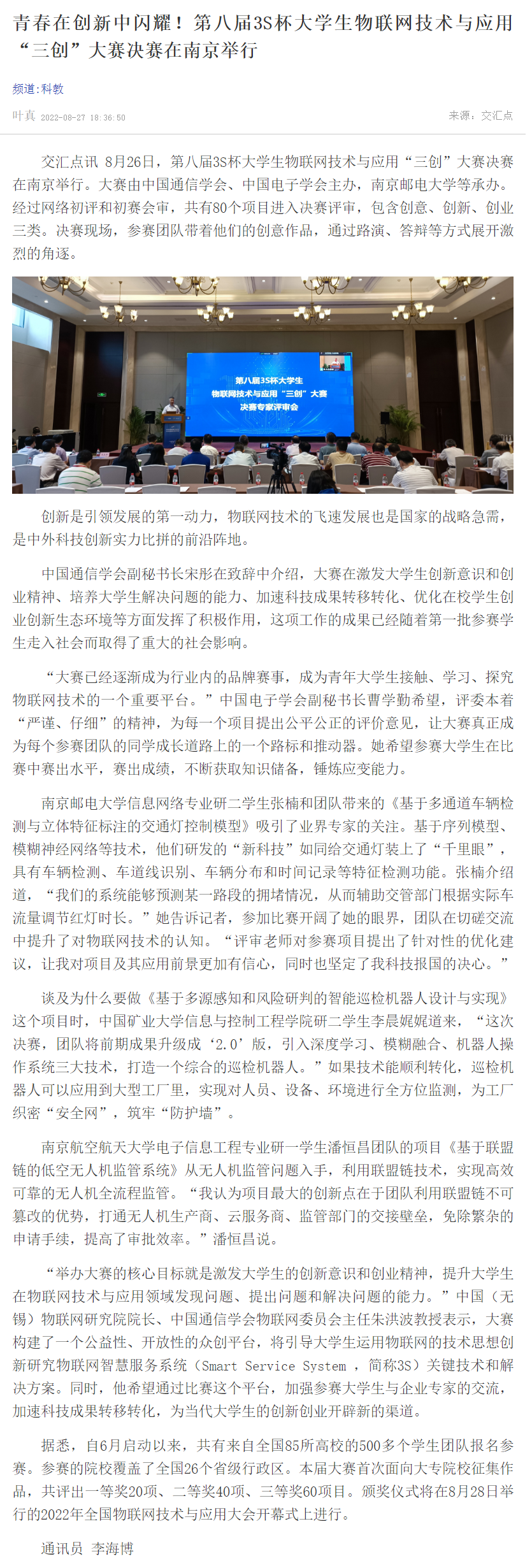 | 【新華日報客戶端】青春在創(chuàng)新中閃耀!第八屆3S杯大學(xué)生物聯(lián)網(wǎng)技術(shù)與應(yīng)用“三創(chuàng)”大賽決賽在南京舉行 |