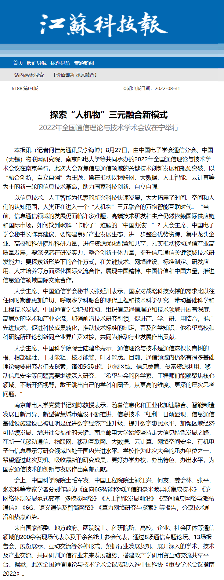 | 【江蘇科技報】探索“人機物”三元融合新模式 2022年全國通信理論與技術學術會議在寧舉行 |