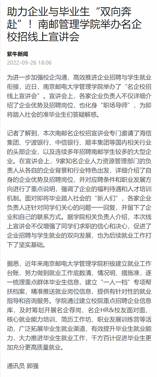| 【揚子晚報客戶端】助力企業與畢業生“雙向奔赴”!南郵管理學院舉辦名企校招線上宣講會 |