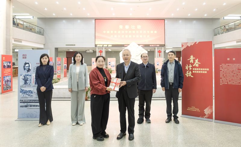 安徽省文聯副主席許春樵作報告 開幕式當天,《青春壯歌——中國青年運動中的雨花英烈專題展》在仙林校區圖書館開展。專題展以“光榮先驅”“革命先鋒”“青春芳華”“強國有我”四大篇章為主線,通過近200張珍貴歷史圖片和文獻,全景展現雨花英烈在中國青年運動中的英勇斗爭歷程,串聯起共青團發展的壯闊脈絡。 近年來,雨花臺烈士陵園管理局與學校雙方以共建“大思政”紅色育人實踐基地為抓手,通過專題展覽、紀錄片展映、實踐項目等形式深化紅色文化育人實效。活動中,雨花臺烈士紀念館向我校圖書館捐贈了一批珍貴史料叢書。這批文獻將進一步充實圖書館紅色館藏資源,為師生研習英烈精神、傳承革命文化提供重要支撐。