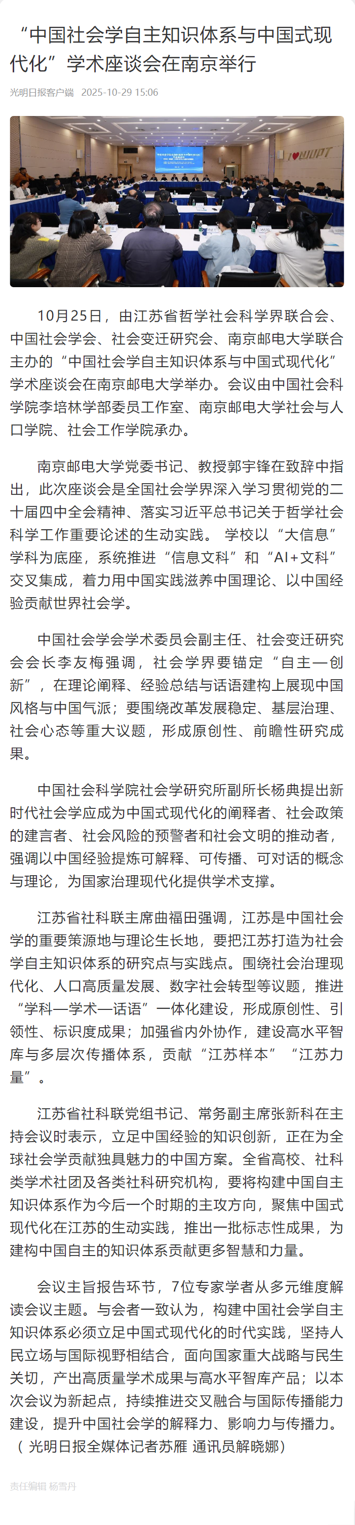 | 【光明日報客戶端】“中國社會學自主知識體系與中國式現代化”學術座談會在南京舉行 |