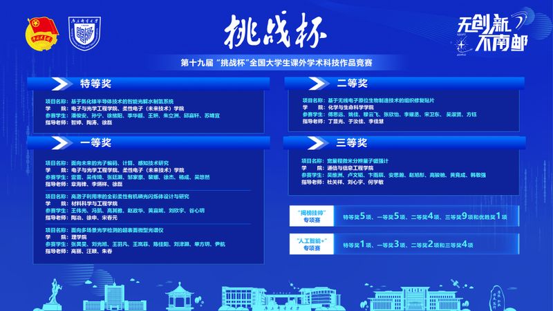 11月3日,第十九屆“挑戰杯”全國大學生課外學術科技作品競賽終審決賽在南京閉幕,南京郵電大學獲主體賽獲特等獎1項、一等獎3項、二等獎1項和三等獎1項;“揭榜掛帥”專項賽特等獎5項、一等獎5項、二等獎4項、三等獎9項和優勝獎1項;“人工智能+”專項賽特等獎1項、一等獎3項、二等獎2項和三等獎4項。南郵首次實現特等獎賽道全覆蓋,競賽總積分達到歷史最好成績,全國并列第十五、江蘇并列第二、省屬高校第一,再捧國賽“優勝杯”。